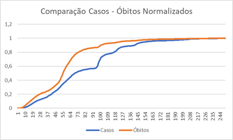 Vamos ver os dois gráficos em conjunto, e com normalizados de modo apropriado (cada um dividido pelo seu número final).
