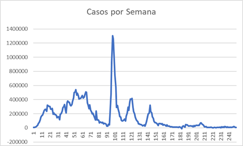 Bom, a resposta é relativamente simples: após um certo tempo nem todas as infecções de COVID eram informadas, e talvez isso seja mais claro no gráfico do número de casos por semana.