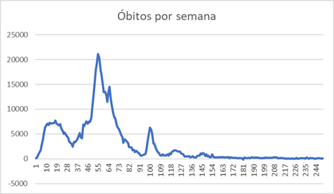 Aqui as coisas começa a ficar estranhas: o número de óbitos pré-data o número de casos. Normalmente o que esperamos é que o número de casos aumente e isso seja seguido por um aumento no número de óbitos. Isso só é o caso quando temos vacinação antes, assim o número de óbitos acumulado se estabiliza em um máximo enquanto o número de casos acumulados ainda vai aumentar mais. Mas isso é o que se espera após uma vacinação. Vamos dar uma olhada no número de óbitos a cada semana